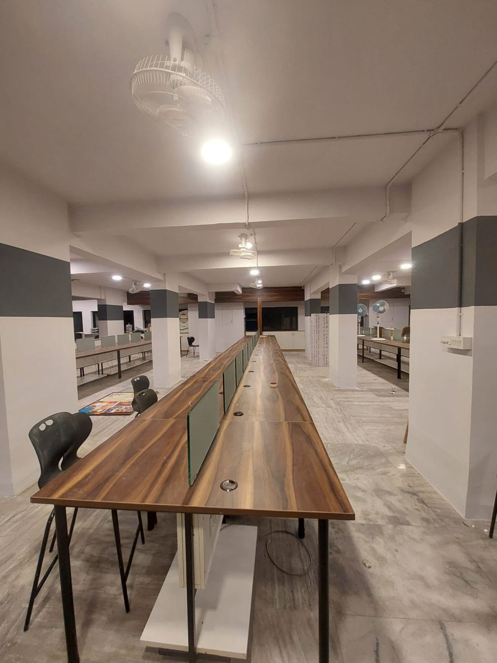 A collection of images showcasing the exterior and interior of Ground Up Coffee Cafe, featuring warm lighting and modern wooden shelves and tables.